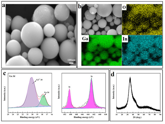 (a) SEM image of eGaIn NDs. (b) elemental mappings. (c) XPS spectra of eGaIn NDs. (d) XRD patterns of eGaIn NDs.