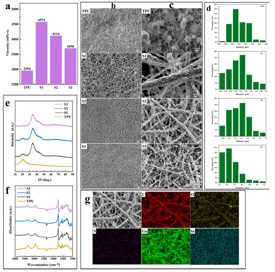 eGaIn NDs/TPU composite. (a) Viscosity of spinning solutions of eGaIn NDs/TPU at different concentrations; (b,c) SEM pictures of eGaIn NDs/TPUs; (d) Fiber diameter distribution map; (e) XRD plots of eGaIn NDs/TPU complexes; (f) FTIR spectra of eGaIn NDs/TPU composites; (g) Elemental mappings of 66.7 wt% eGaIn NDs s/TPU composite.
