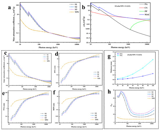 (a) MAC of the composites; (b) PA, CS, and PP contributions to the Sample 3; (c–f) , HVL, TVL, and MFP values of the eGaIn NDs/TPU composites; (g) HVL and TVL of Sample 3; and (h) Zeff of the composites.