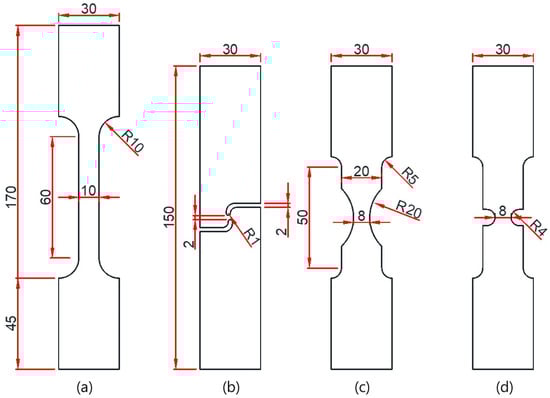 Quasi-static tests were performed to investigate the plasticity characteristics and fracture model parameters of SUS304L. The chemical composition of this material is provided in Table 1. Figure 1 illustrates the dimensions and labels of the uniaxial tension specimens specifically designed to induce different fracture modes. All specimens had a thickness of 2.0 mm. The standard flat bar type specimen (FB) with a 60.0 mm gauge length and 10.0 mm gauge section was specifically designed to obtain mechanical properties in compliance with ASTM E08 standards [31]. The notch tension specimen (NT) featured a circular cut-out with a 20.0 mm radius for the notch. The plane strain tension specimen (PST) had a 4.0 mm radius for the notch. The shear specimen (SH) was specially designed to occur pure shear in the uniaxial tension test. Uniaxial tension tests were conducted using a servo-mechanical loading frame (Samyeon Tech, Daegu, Republic of Korea) with a 50 mm extensometer (Epsilon Tech, Jackson, WY, USA). The testing speed was set at 2.0 mm/min, and all tests were performed at room temperature.