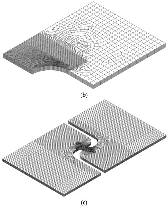 To perform fracture simulation using the proposed HC model for SUS304L, a quarter finite element (FE) model of DECT was created. The model used a reduced integration-type solid element (C3D8R in Abaqus). as illustrated in Figure 11. The finite element model was created under 1/8 of the symmetric conditions for length, width, and thickness. The model was meshed with six elements in half of its thickness. The enforced displacement was applied at the top node. Mesh sensitivity issues near the crack tip line were addressed in a previous study, and the element length around the crack tip was determined to be 0.1 mm [22]. The ABAQUS/explicit user-defined subroutine VUMAT was developed to define the damage indicator at every Gauss point in finite element analysis [6]. This element experienced a loss of stiffness when the damage indicator reached a value of one.