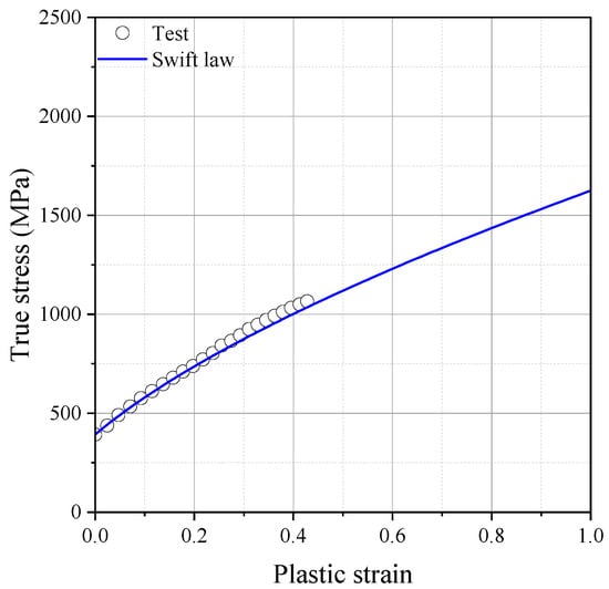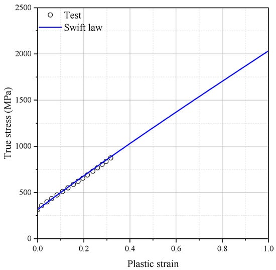 As shown in Figure 2, plastic deformation occurs when exceeds the surface yield. The plastic multiplier is described using the hardening parameter. In this study, the Swift isotropic hardening law was adopted to describe the stress–strain relationship over the onset of necking: