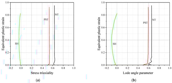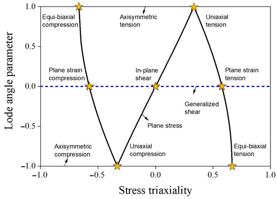 The stress state of an isotropic ductile material can be elucidated through dimensionless parameters as follows: stress triaxiality denoted as and the lode angle parameter represented as . These two stress state parameters can be represented in the plane stress state, as shown in Figure 5. These parameters are formulated based on the invariants of the Cauchy stress tensor and can be articulated as follows: