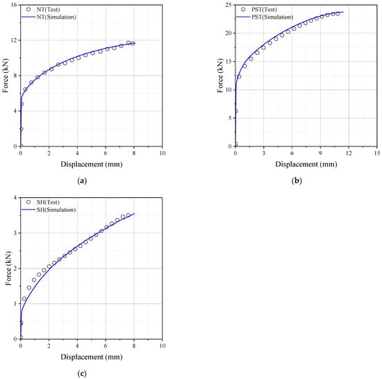 Force–displacement curves (a) NT; (b) PST; (c) SH.