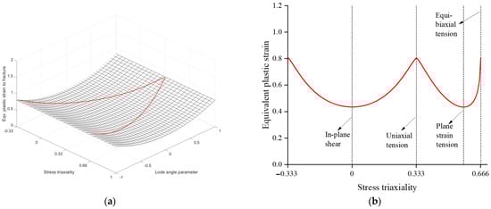 The index indicates the number of experiments for calibration. In this study, three tests, NT, PST, and SH were used for calibration. The optimization procedure was conducted using MATLAB, and the calibrated HC model parameters were , , . Figure 9a illustrates 3D fracture loci with a red line representing the plane stress condition, while Figure 9b shows the fracture loci under the plane stress condition. The ductility limit of SUS304L was dependent on the lode angle parameter. A change in stress triaxiality did not significantly affect the variation in fracture strain. It is worth noting that the fracture locus exhibited the lowest ductility in the plane strain tension state.