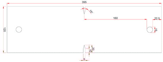 Tension tests were conducted on SUS304L specimens with an initial crack, named the double-edge cracked tension test (DECT) [28]. These experiments were specifically designed to resemble structures with an initial crack. Figure 10 illustrates the specimen’s geometry, with a thickness of 1.2 mm. Furthermore, standard dog bone-type specimens were subjected to tensile tests to acquire the mechanical properties of SUS304L. In all cases, the tests continued until fracture took place at a consistent loading rate of 1 mm/min.