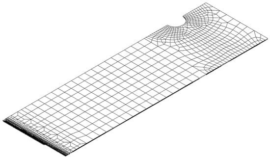 Before the onset of necking, the flow stress was obtained from the tensile test for the FB specimen. The hardening model parameters are determined by an iterative approach based on experimental and numerical results for the FB and NT specimens. The stress–strain curves before the onset of necking were obtained using standard tension tests on flat bar specimens, and the flow stress beyond the large plastic strain region was extrapolated using the hardening law. The presented hardening model parameters were verified through numerical analysis for the cases of NT, PST, and SH. The detailed calibration procedure was introduced in a previous study [6]. Figure 3 illustrates the finite element (FE) model, which includes one-eighth of the gauge section and was created using eight-node solid elements (C3D8R). The element size of 0.1 mm was determined through a convergence test, i.e., ten elements were meshed at half thickness. Figure 4 shows the hardening curves of the tension test for FB and extrapolated flow stress using the MATLAB curve fitting tool (Natick, MA, USA) with the Swift hardening equation and the test result. The identified Swift hardening model parameters were , respectively.