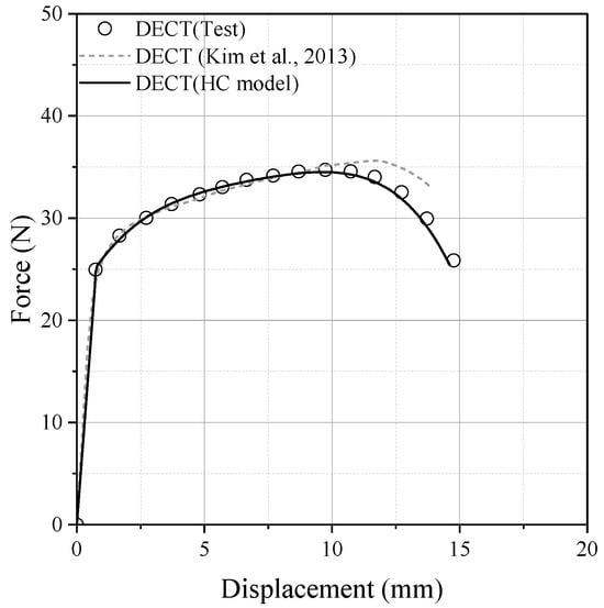 Swift model parameters were re-modeled to improve the accuracy of numerical prediction and also address the effect of uncertainty in the material property ranges. As shown in Figure 12, the fracture simulation for DECT was performed with the newly identified Swift model parameters of . The accuracy of the fracture model was validated by comparing the force and displacement curves between the experiment and fracture simulation.