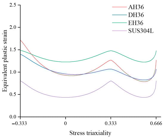 - Numerical simulations were employed to obtain the loading history until the initiation of fracture, and the Hosford–Coulomb model parameters were determined using an optimization process within a damaged framework. Figure 14 illustrates the 2D ductile fracture loci of AH36, DH36, EH36, and SUS304L steel under plane stress conditions. In all fracture models, the lowest ductility was observed in the plane strain tension state. Notably, SUS304L steel exhibited lower ductility compared to other general shipbuilding steels.