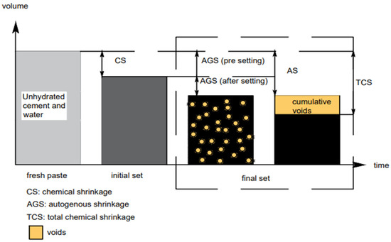 An essential shrinkage parameter responsible for theses cracks is CS. It takes place during the hydration of cement, whereas the total hydrate volume created is less than that of its reactants. CS is usually considered as the main driving mechanism, which contributes to early age cracking and durability loss of cement-based materials [18,19]. During the early stages of hydrations and before hardening takes place, the AGS and CS are approximately equal [14,20,21,22]. After that, CS results in developing internal pore structures and capillary internal stresses. In order to determine CS, cement paste must be water-saturated and the external imbibed water needs to replace empty pores, which are responsible for the total volume change.