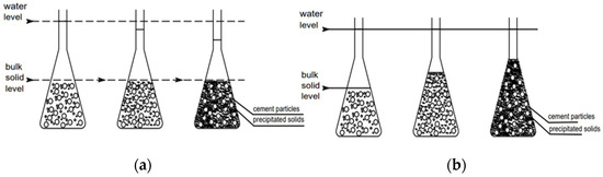 CS is measured on a fully saturated sample. Excess water is imbibed into the hydrated cement paste and volume change can be measured. Accordingly, the thickness of the cement paste sample should be small enough to allow water penetration to the entire depth of the sample. The CS can be measured by either the volumetric or gravimetric techniques. The volumetric technique can be conducted using either the dilatometry or the pycnometry method (Figure 3a,b). The first volumetric method involves measuring the change in the water level which is indicative of the volume change inside the sample. This methodology was firstly developed by Le Chatelier [16] and is generally denoted as the dilatometry measurement method [37,38,39] which can be calculated as follows: