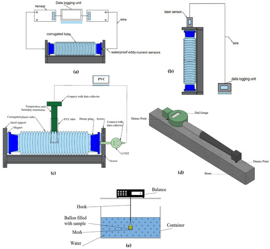 AGS measurements: (a) corrugated plastic tube (horizontal direction [57]); (b) corrugated plastic tube (vertical direction [71]); (c) new device for linear horizontal measurement [72]; (d) linear autogenous shrinkage measurement in hardened stage [73]; (e) volumetric autogenous measurement device [56].