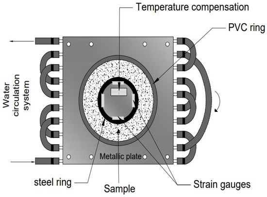 To measure the deformations in restrained conditions, the “ring test” method is used, which involves casting fresh cement-based material around a steel ring equipped with strain gauges connected to a data acquisition system [75]. To ensure quasi-isothermal conditions during the tests, a peripheral water circulation system is used with the temperature controlled by a thermostatic water bath. The device automatically monitors the deformations of the steel ring and detects the moment when the cement-based material cracks. Figure 5 provides the ring test device system.