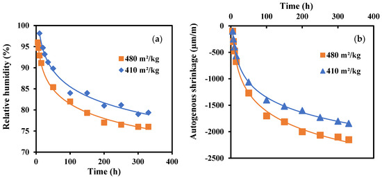 Effect of cement fineness on (a) relative humidity and (b) autogenous shrinkage [84].