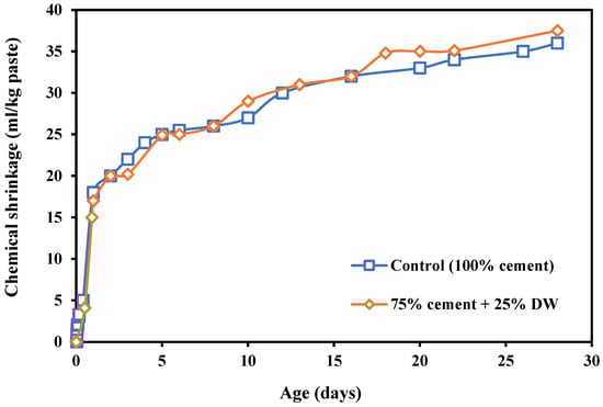 The volume of hydrated products of cement paste is smaller than the volume of the reactants (i.e., cement and water). This phenomenon is referred to as chemical shrinkage, hardening shrinkage or Le Chatelier shrinkage [16,17,18,19,23]. Le Chatelier measured the reduction in cement paste volume by means of a simple dilatometer using a glass beaker attached to a tube filled with water. It was found that the total chemical shrinkage (TCS) of Portland cement (PC) was 4.60% by weight of cement. CS is occasionally referred to as “internal autogenous shrinkage” and AGS as “external chemical shrinkage” [24,25]. Additionally, internal autogenous shrinkage (chemical shrinkage) should not be confused with external chemical shrinkage (autogenous shrinkage) which is the change in the external dimensions of materials. In general, the external dimensions can decrease due to self-drying (autogenous shrinkage), external drying (drying shrinkage), or increase due to water absorption (swelling) [26]. Shrinkage will occur even though the hydrated products are smaller than the volume of the reactants (cement and water) and even if the material undertakes external expansion. Moreover, CS is usually up to two times higher than AGS. CS is directly dependent on the degree of hydration.
