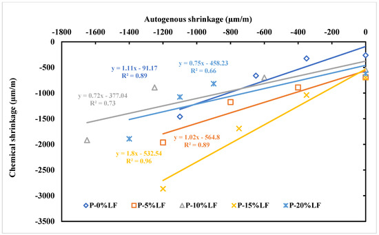 Many authors have examined the effect of incorporating limestone fines (LF) as a cement replacement on the chemical and autogenous shrinkage of cementitious systems. The presence of LF in cement-based mixes stimulated the growth of CS [126,127,128]. An experimental study concluded that mixing LF with calcined clay (CC) substantially increased the chemical shrinkage during the first 7 days [129]. Khatib et al. [130] found that adding between 10 and 15% of LF increased both the AGS and CS of paste. Additionally, it was reported that a high correlation existed between the two shrinkage parameters as shown in Figure 9. Also, Khatib et al. [131] and Khatib et al. [132] examined the CS and AGS of mortars for a total period of 90 days and stated that adding up to 10% LF increased both shrinkage parameters. Another study conducted by Khatib et al. [133] focused on the correlation between CS and compressive strength of pastes and mortars at different percentages of LF (0 to 20%) and different curing ages (1 to 90 days). As shown in Figure 10, there exists a correlation between CS and compressive strength. The finding indicates that CS is an essential parameter in predicting the development of compressive strength. The presence of LF accelerates the CS and hydration mechanism at early ages [134,135]. Contrary, Wang et al. [136] reported that LF reduced the rate of CS and increased the humidity of the matrix which might be caused by the presence of LF filling the internal pores in the paste. A study conducted by Courard and Michel [137] reported that adding a small amount of LF enhanced the AGS of concrete. However, the addition of LF with a particle size of 16 µm as the cement substitution decreased the AGS of concrete [138].