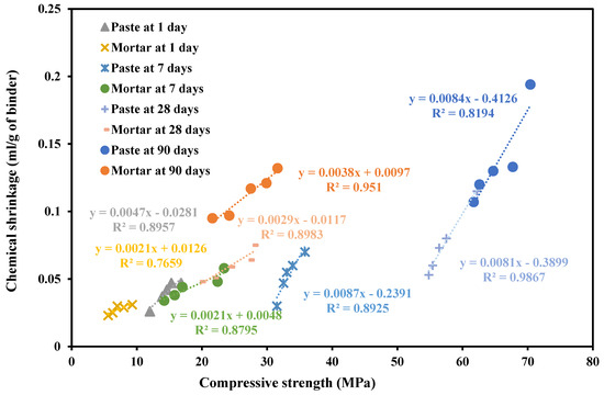 Correlation between compressive strength and chemical shrinkage for pastes and mortars at different curing ages [133].