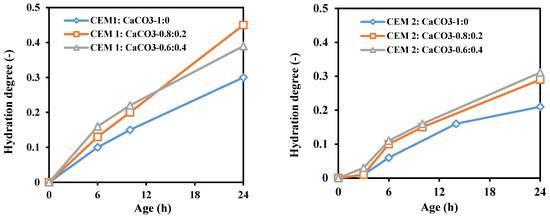Generally, the degree of hydration is defined as the part of cement that has been completely reacted with water relative to the total cement content in the paste. Moreover, the degree of hydration can be affected by w/b, cement type, SCMs and temperature. The hydration degree is modeled by applying diverse techniques like microstructural analysis or thermodynamics [140,141,142]. As reported by Chen et al. [143], the model of CS and AGS is suitable during the first week of hydration. The modeling is achieved using the stratifying capillary tension method. The progression of the hydration degree and the saturation fraction are calculated by applying calometric data and a power volumetric model, respectively. Bouasker et al. [134] reported the evolution of the hydration degree of two types of cement (CEMI and CEMII). It was stated that LF encouraged the initial hydration rate regardless of the types of cement. This can be explained by the presence of LF particles which may act as nucleation sites leading to an increase in the hydration reaction. During the first 12 h, the increase in the LF content (from 20 to 40%) had not caused further acceleration of the cement hydration. However, beyond this period of time, the hydration rate for CEMII is greater than that for CEMI-a as shown in Figure 11.