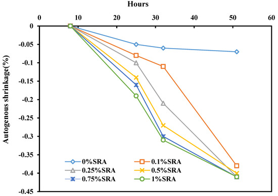 Percentage decrease in autogenous shrinkage with different percentages of SRA [156].