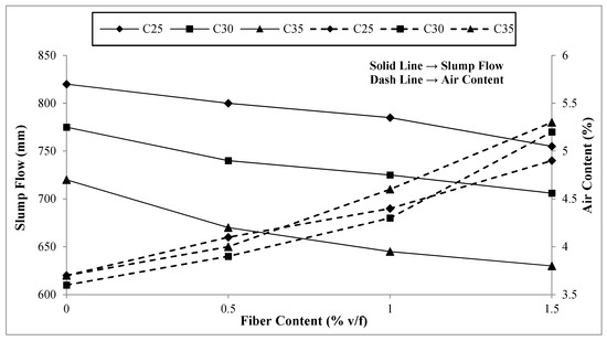 As can be observed from the test results, there is no significant difference in the fresh concrete density, and the variation is within 5%. However, there is some variation in the slump flow and significant variation in the air content of the concrete. The test results of the slump flow and air content are presented in Figure 3.