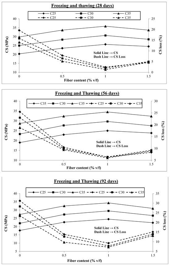 Figure 4 shows the test findings for samples with varying fiber content and those without fibers subjected to freezing and thawing cycles. All samples were moist-cured for 14 days and then exposed to freezing and thawing cycles. The freezing period was for 12 h at −15 °C followed by 12 h of thawing in the water tank at room temperature until testing day, i.e., 28, 56, and 92 days. In total, 108 samples were tested and the results were examined. The tests’ findings have various outcomes, which are discussed.