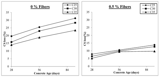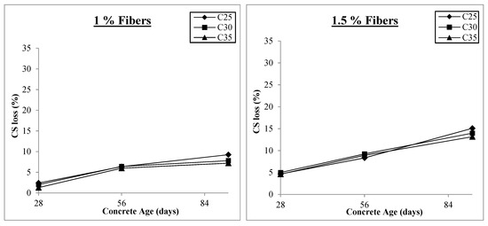 Another important discovery from the test results is that similar to freezing and thawing, strength losses are smaller in concrete with higher compressive strength than in concrete with lower compressive strength at the same fiber content. Due to the resistance offered by the fibers and the fact that higher compressive strength also translates to improved tensile strength of concrete, C35 performs better than C25. Furthermore, it is clear from Figure 6 that the difference in compressive strength losses is higher with 0% fibers and decreases with fiber content increasing to 1%, demonstrating the best results. This is because, while there are no fibers in the concrete, only its tensile strength can withstand hydraulic pressure; however, as the fiber content rises, the fibers’ bridging activity may now give extra resistance, negating the impact of the concrete’s tensile strength. The results for compressive strength losses are shown in Figure 7 for fiber contents of 0%, 0.5%, 1%, and 1.5%.