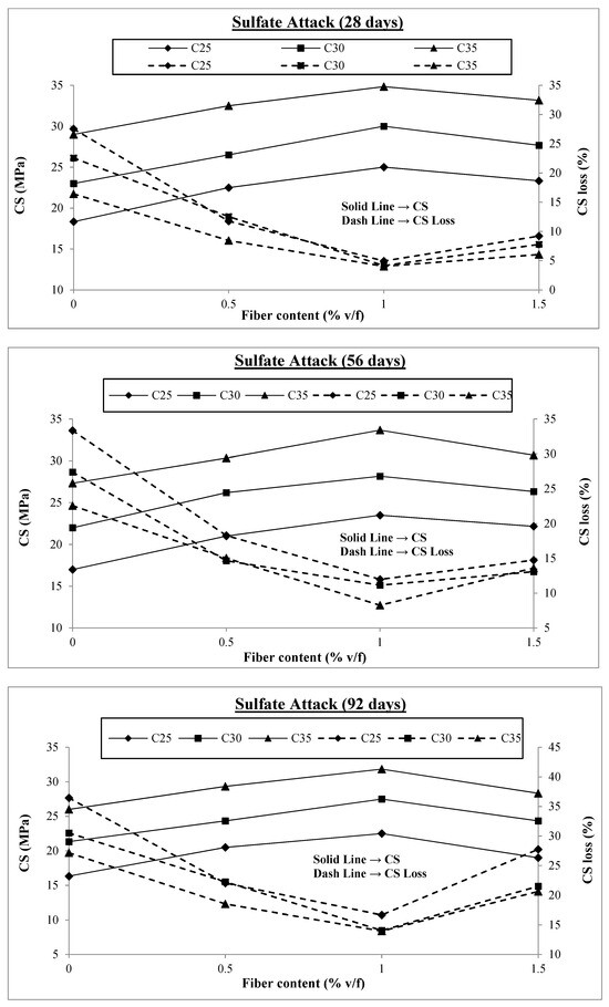 It may be observed from Figure 6 that there is a significant loss in the compressive strength of concrete when exposed to sulfate attack. The maximum loss in compressive strengths at the concrete ages of 28 days, 56 days, and 92 days are 27.5%, 33.3%, and 36.4%; those were for C25 concrete containing no fibers. This means that almost one-third of the concrete strength is lost. However, with the addition of macro-polypropylene fibers to the concrete, this negative impact of sulfate attack is significantly reduced. The maximum reductions in compressive strength loss are all with 1% fiber content and at the concrete age of 92 days. These reductions are 54%, 54%, and 48% for C25, C30, and C35, respectively. Beyond this value, the strength loss starts to increase again. When exposed to 5% sodium sulfate solution, there is a reduction in compressive strength loss from 20% to 11% with the addition of 0.3% of PP fibers by weight of the cement into SCC [67]. Similarly, another study reported that PP fibers in SCC incorporated at 0.10% along with 20% of granite powder exhibit 25.4% improved strength at 90 days of exposure to sulfate solution [29]. Another study reported that using waste macro PP fibers of 30 mm length by 1% v/f improves the compressive strength loss reduction by 30.39% against sulfate attack [54]. In the case of freezing and thawing cycles, the strength loss at 1.5% fiber content was similar to that for concrete with 0.5% fiber content; however, in the case of sulfate attack, the compressive strength loss with 1.5% fiber content at 92 days is even more than that for concrete containing 0.5% fibers. Other researchers reported similar trends of SCC incorporated with polypropylene fibers [27,68]. In this kind of exposure, the sulfate solution seeps into the concrete and reacts with the hydrated cement paste to form calcium sulfoaluminate or ettringite. The volume of ettringite is more than that of the original compounds reacting to form it, so it exerts pressure within the concrete similar to the hydraulic pressure in freezing and thawing, leading to crack formation. These internal stresses are resisted by the concrete’s tensile strength and the additional strength provided by the fibers’ bridging effect.