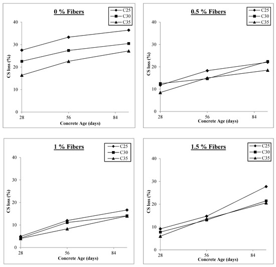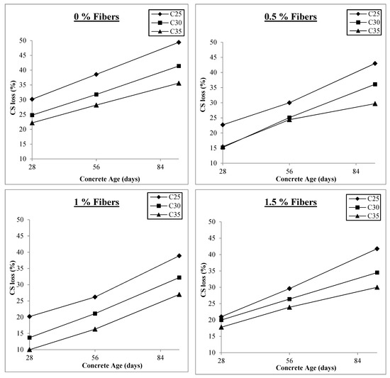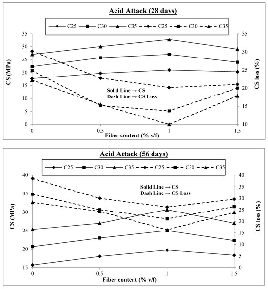 Like freezing and thawing and sulfate attack, the strength losses are less in concrete with higher compressive strength than in concrete with lower compressive strength at the same fiber content. Thus, C35 performs better than C25 because its higher compressive strength results from more cement paste and better quality, which takes longer to be disintegrated by acid attack. Figure 9 presents the results for compressive strength losses at 0%, 0.5%, 1%, and 1.5% fiber contents.