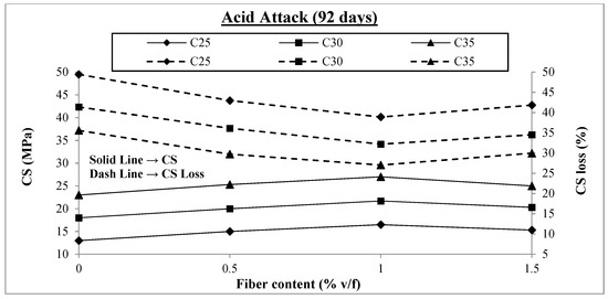 It can be observed from Figure 8 that there is a significant loss in the compressive strength of concrete when exposed to acid attack, more than that of freezing and thawing and sulfate attack. The maximum loss in compressive strength at the concrete age of 92 days is 49.4%, which is for C25 concrete containing no fibers. This means that half of the concrete strength is lost at the concrete age of 92 days. However, with the addition of macro-polypropylene fibers to concrete, this negative impact of acid attack is reduced but not to the same extent as in the case of freezing and thawing and sulfate attack. The maximum reductions in compressive strength loss are all with 1% fiber content, and at a concrete age of 92 days, these reductions are 21%, 22%, and 24% for C25, C30, and C35, respectively. Beyond this value, the strength loss starts to increase again. A study investigated the effect of NaCl, MgSO4, and H2SO4 solutions on the compressive strength loss of self-compacting fiber-reinforced concrete when immersed for 120 days. The NaCl solution did not affect the compressive strength; however, H2SO4 and MgSO4 solutions reduced compressive strength by 12.9–40.6% and 12.1–15.8%, respectively [69]. Another study reported that using waste macro PP fibers of 30 mm length by 1% v/f improves the compressive strength loss reduction by 28.47% against acid attack [54]. Similarly, another study reported that PP fibers in SCC incorporated at 0.10% exhibit 16.5% strength loss reduction at 90 days of immersion in 3% dilute sulfuric acid [67]. In the current study, similar to the test results for freezing and thawing, the compressive strength loss with 1.5% fiber content at 92 days is similar to that for concrete containing 0.5% fibers. Other studies also support these research findings [18,29]. Concrete disintegration in an acid attack differs from that of freezing and thawing and sulfate attack, where the main disintegration is caused by internal stresses caused by pressure inside the concrete. However, in the case of an acid attack, the cement paste is directly attacked by the acid solution, disintegrating the hydrated cement paste, which is dissolved into the acid solution and thus removed, leaving behind a soft and weak mass. The impact of fiber addition to concrete is not significant because fibers only play a secondary role in maintaining the integrity of concrete by binding it together and cannot resist the acid attack directly, unlike in the cases of freezing and thawing and sulfate attack where the bridging effect of fibers plays a vital role in resisting the internal tensile stresses and reducing the impact of severe exposure.