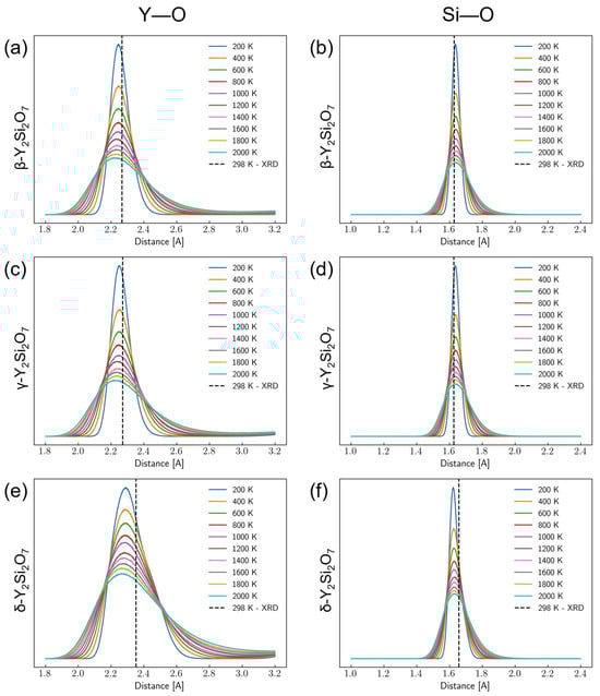 Radial distribution functions for Y–O and Si–O bonds from 200 K to 2000 K for the Y–O bonds in the (a) β-, (c) γ-, and (e) δ-phases of Y2Si2O7 as well as the Si–O bonds in the (b) β-, (d) γ-, and (f) δ-phases of Y2Si2O7 as extracted from molecular dynamics simulations using the developed interatomic potential. The vertical dashed lines are the bond lengths determined from XRD experiments at room temperature.