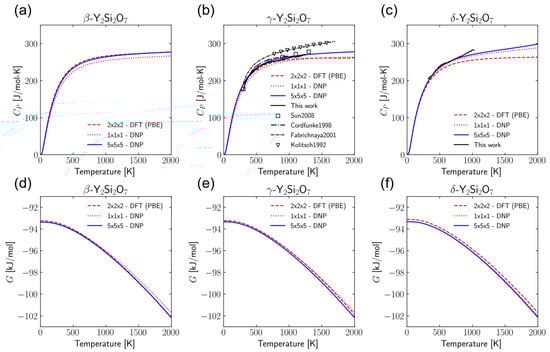 Constant pressure heat capacities (CP) and Gibbs free energy (G) for β- ((a) and (d), respectively), γ- ((b) and (e), respectively), and δ-Y2Si2O7 ((c) and (f), respectively) calculated from DNP finite-displacement phonon calculations compared to DFT and experimental results, including Sun2008 [86], Cordfunke1998 [87], Fabrichnaya2001 [88], and Kolitsch1992 [89].