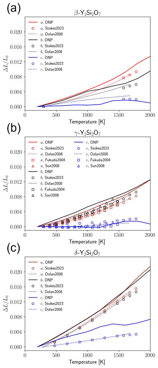 Thermal expansion of (a) β-, (b) γ-, and (c) δ- Y2Si2O7 calculated from DNP trajectories. The dotted curve represents the fitted model from Dolan et al. [73]. Square, circle, and triangle markers represent experimental data from Stokes et al. [24], Fukuda et al. [76], and Sun et al. [86], respectively.