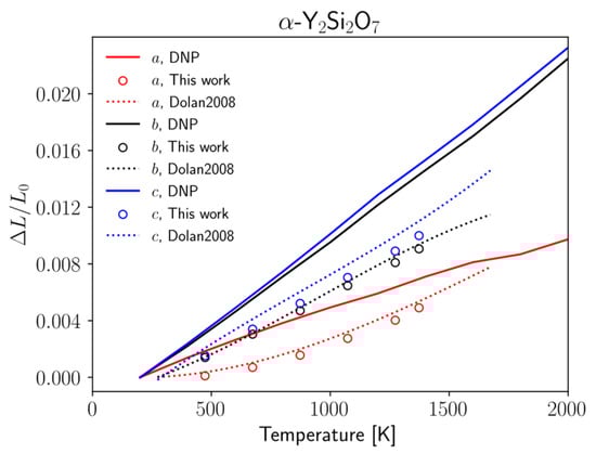 Thermal expansion of the α-Y2Si2O7 calculated from DNP trajectories. The dotted curve represents the fitted model from Dolan et al. [73]. Circle markers represent experimental data from this work.