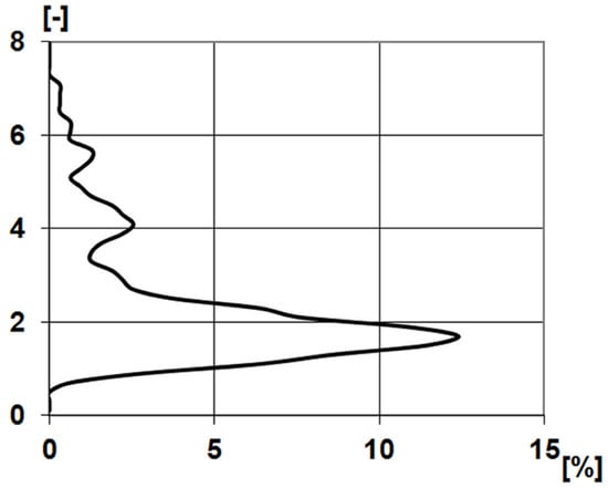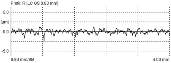 The wavelength of measurements on roughness profiles is indicated by the parameter of the average distance of the profile elements (RSm). The average RSm parameter on the 10 measured profiles was 163.1 μm, with a deviation of 24.6 μm. A typical roughness profile of the surface is shown in Figure 6. The PSD function of the profiles is much more informative. Figure 7 shows the PSD amplitude dependent on the wavelength, of which the 178 μm value stands out, indicating the dominant wavelength of the surface.