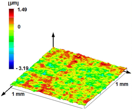 The stylus microtopography of the surface can be seen in Figure 8 and Figure 9. Figure 8 shows a 1 mm × 1 mm surface area, while Figure 9 shows a 200 μm × 200 μm portion of this. Determining the dominant wavelength is not easy either here; as can be seen in the profile of Figure 6, the dominant elements on the surface have 2–4 local maxima. Note that the value of the RS parameter—an average distance of local maxima—was 32.9 μm on average measured profiles, i.e., significantly different from RSm. This effect can be detected in the PSD curve and the topographic image.