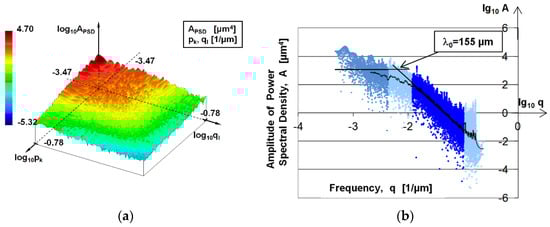 In 3D PSD analysis, the frequency range depends on the measured area and sampling distance. The lowest frequency was the reciprocal of the measuring length, while the upper limit was based on the Nyquist–Shannon sampling theorem. This frequency range was divided into 125 parts in both coordinate directions and then, using a consolidation proposed by Persson [9], a 2D logarithmic scale PSD curve was generated. The basis of Persson’s reduction is that PSD topography seems like a truncated cone (see the upper right part of Figure 5) that needs only two coordinates (namely the height and the radius) to be described. The resulting 15,625-point PSD curve (see the lower right part of Figure 5) was used to determine the slope of the curve from which the fractal dimension can be determined.