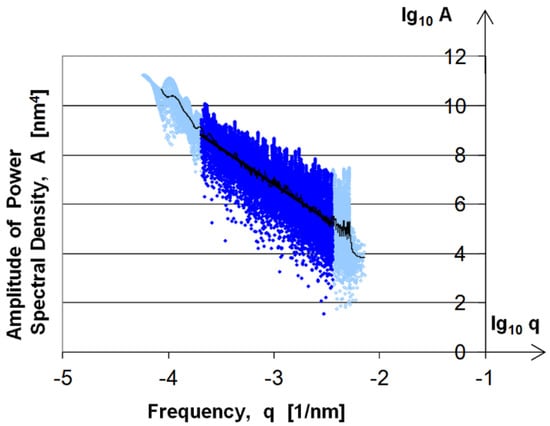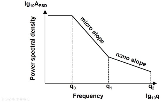 The primary goal of our investigations was to reveal the wavelength characteristics and fractal behaviours of the examined surface. Our hypothesis is presented in Figure 14, which separates three ranges by displaying the amplitude density spectrum function on a logarithmic scale. These ranges are separated from each other by the cutoff frequencies q0 and q1.