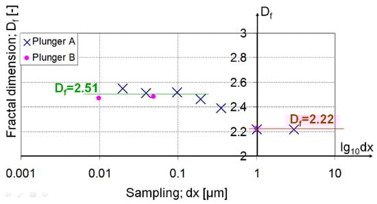 The effect of inaccuracies caused by different measurement settings cannot be detected in the results due to the small value of the sampling step applied. Thus, the different sampling steps did not cause significant errors in the evaluation. This is supported by the same fractal results of the measurements carried out on various specimens (see purple points and blue x in Figure 15). Additionally, the effect of the measurement methodology did not influence the results because although the fractal results were significantly different in the two measurement techniques, the transition could also be observed in the largest increment in AFM measurements. In addition, there is a negligible effect of the sampling step in the case of stylus measurements as all three measurements gave the same result. Thus we can state that the above method can display the limit point q1 (see Figure 14) that represents the extreme value of fractality associated with machining. For our investigations, this transition is within the sampling distance of 196.1–1000 nm. This means that the fractal dimension, Df = 2.22 for machining (for micro-roughness) is only valid in the frequency range greater than 1 μm. Under 196.1 nm, the fractal dimension is around 2.5. It supposes different sources of surface unevenness in this regime than machining, and it also means that any changes in the production process will not influence this nano-roughness.