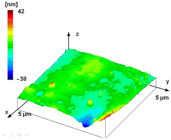 The fact that the former self-affine disappears below this range can be justified by the topographic image of the smallest AFM measurement surface. The topography shown in Figure 16 is no longer similar to the surface structures measured at larger measurement ranges (see Figure 8, Figure 9 and Figure 11). The topographic elements of the surface do not show traces of manufacturing but reflect the characteristics of material structure or other processes that determine nano-roughness.