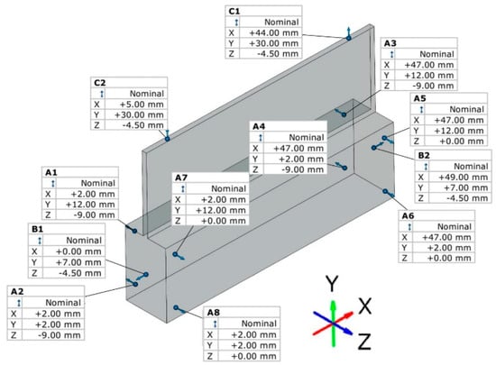 - Dimensional and shape accuracy—the maximum deviation values (omitting the sign preceding the value) for each of the measured planes (planes 1–6 and 1’–6’) selected in Section 2.2 were assumed; sixs values for each of the machined sides (input and output).