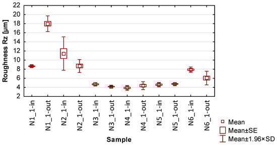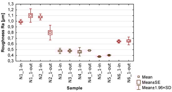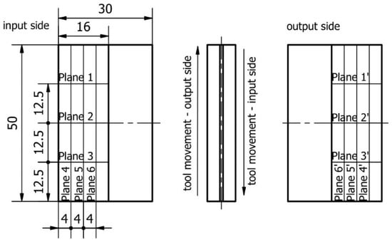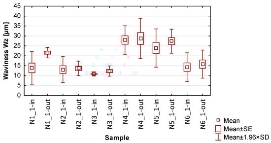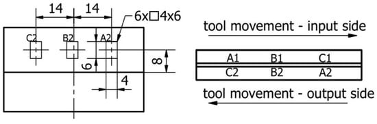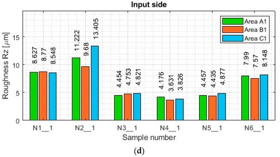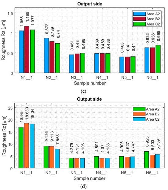 - Surface topography—the values of ripple parameters Wa, Wz and roughness Ra, Rz determined in 6 measurement areas (areas A1–C1 and A2–C2), which were selected in Section 2.3 (three measurement areas for each of the machined sides—the input and output sides), were adopted.