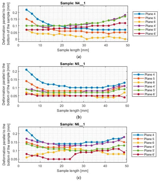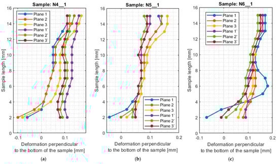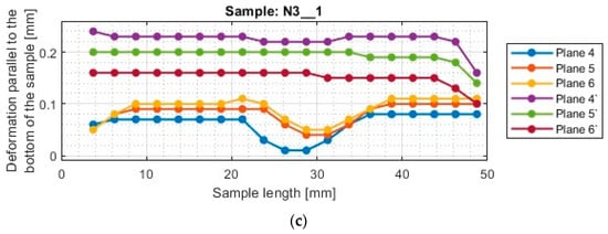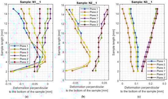 - Comparing the deviation result of individual nickel alloy samples with the values obtained in papers [20,21,22,23,24] containing deformation results for titanium alloy samples, it can be seen that lower maximum values were obtained for sample N2_1 (maximum deviation: 0.08 mm). It is worth mentioning that close values of deviations to those obtained in the cited publications are also shown by sample N1_1 (maximum deviation: 0.14).