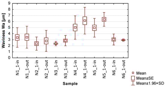 - The use of cylindrical side milling (compared to face milling) provides lower average values and allows for minimizing the scatter of roughness parameter results. In the case of waviness testing, the trend is the opposite, i.e., the use of lateral face milling (compared to cylindrical) gives lower values for waviness parameters;