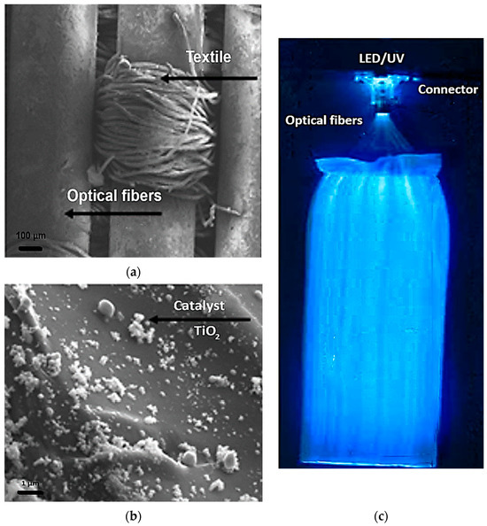 The luminous fabric was supplied by Brochier Technologies and it consists of polymethyl methacrylate (PMMA) optical fibers and polyester textile fibers. All the optical fibers were woven in the same direction and gathered at one end in an aluminum connector held intact by a layer of Silica. The density of TiO2 deposited on the fabric is about 12 g/m2. The new support enables pollutants to be completely decomposed while making the treatment system more compact. This installation is presented in Figure 1 with SEM images of the luminous fabric before and after the deposition of TiO2.