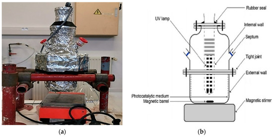 The first set-up shown in Figure 3a,b is a batch reactor with a capacity of 1.5 L. The solution in the batch reactor was continuously agitated using a magnetic stirrer to achieve homogenization of the liquid phase. The cellulose paper catalyst is suspended on a stainless-steel support and fixed inside the reactor.