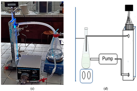 A new continuous-flow reactor was designed with two rectangular Plexiglas plates and covered with aluminum foil to ensure that UV rays are reflected on the photocatalytic surface (Figure 3c,d). An LED with a maximum emission wavelength of 365 nm was used for all experiments., A pump was used to recirculate the solution containing the pollutant between the reactor and the tank. Measurements of the electrical energy consumed during the photocatalytic oxidation of the pollutant on each device were carried out separately using two VOLTCRAFT. ENERGY-LOGGER 4000F devices (Bralin, Poland).