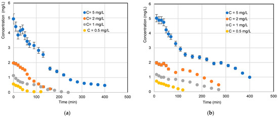 A plot of concentration vs. time for four initial concentrations is shown in Figure 4. It can be seen that, overall, increasing the concentration has a negative effect on pollutant degradation. At lower concentrations, kinetics are faster, which can be explained by the fact that more TiO2 active sites are available for pollutant adsorption, and UV light reaches the catalyst surface more easily, leading to a faster rate of photocatalytic degradation. However, at high concentrations, the molecules begin to act as a screen for incident UV light. Thus, the very limited photons reached the TiO2 surface, leading to a decrease in photocatalytic degradation. It can also be assumed that the availability of active sites decreases with increasing concentration as a result of this screening effect. This trend is similar to that found by Dehibi and her co-workers with the photocatalytic degradation of paracetamol [2].