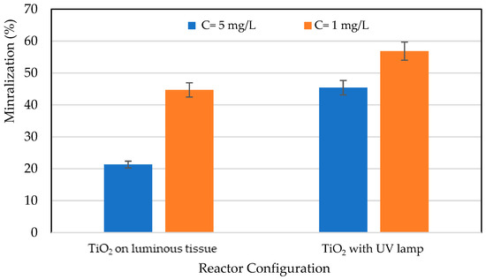The evolution of mineralization of RB5 was determined by measuring TOC as a function of time. Based on the results, the mineralization decreased with the increase in inlet RB5 concentration. This trend is due to the limitation of active sites on each configuration (TiO2 on optical fibers or cellulosic paper). Moreover, Figure 5 shows that the reactor configuration plays a considerable role in the mineralization rate, since mineralization is high when irradiation is carried out using a UV lamp, unlike the first case without LEDs, where illumination is provided by optical fibers [8,20].
