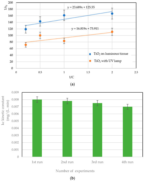 (a) Linear regression using the LH model for RB5 degradation in the presence of TiO2 on a UV lamp. (b) Kinetics of reusability cycle of TiO2 on luminous fabric.