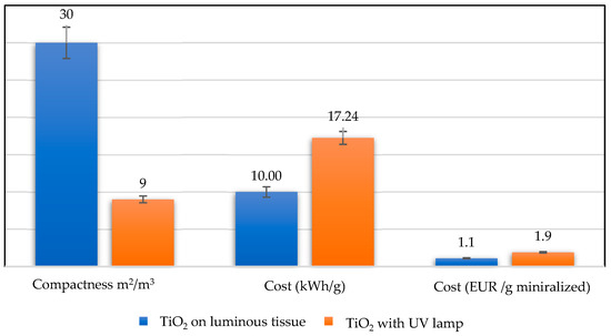 It is observed that the degradation kinetics with the TiO2 + UV lamp configuration were faster than with the light fabric. There is a reaction kinetic factor of 1.5 between the two configurations. Contrariwise, if the energy cost has been considered for reactor comparison, i.e., the electrical power consumed to degrade one gram of RB5 in solution, the configuration of TiO2 configuration on luminous tissue presented an interesting performance (Figure 7).